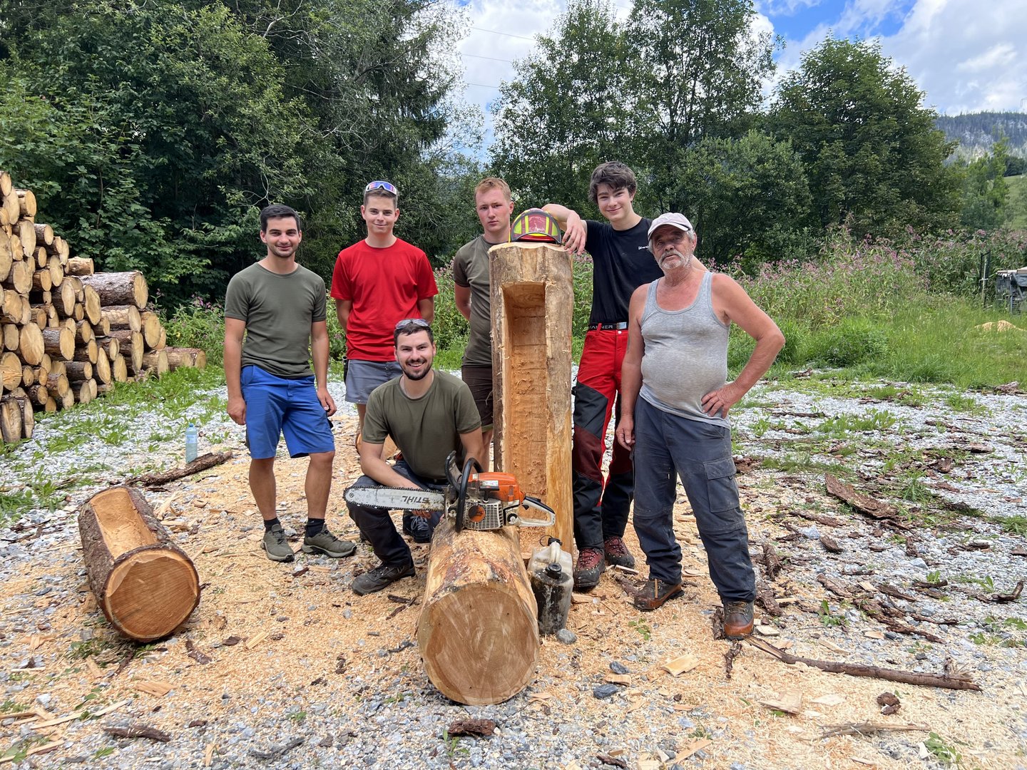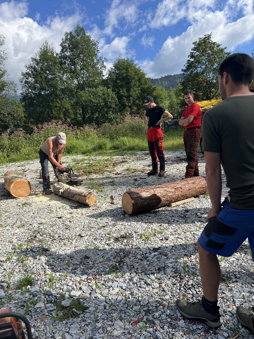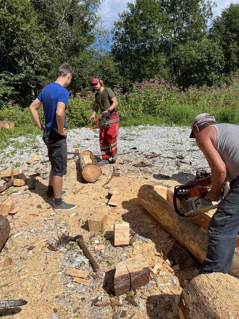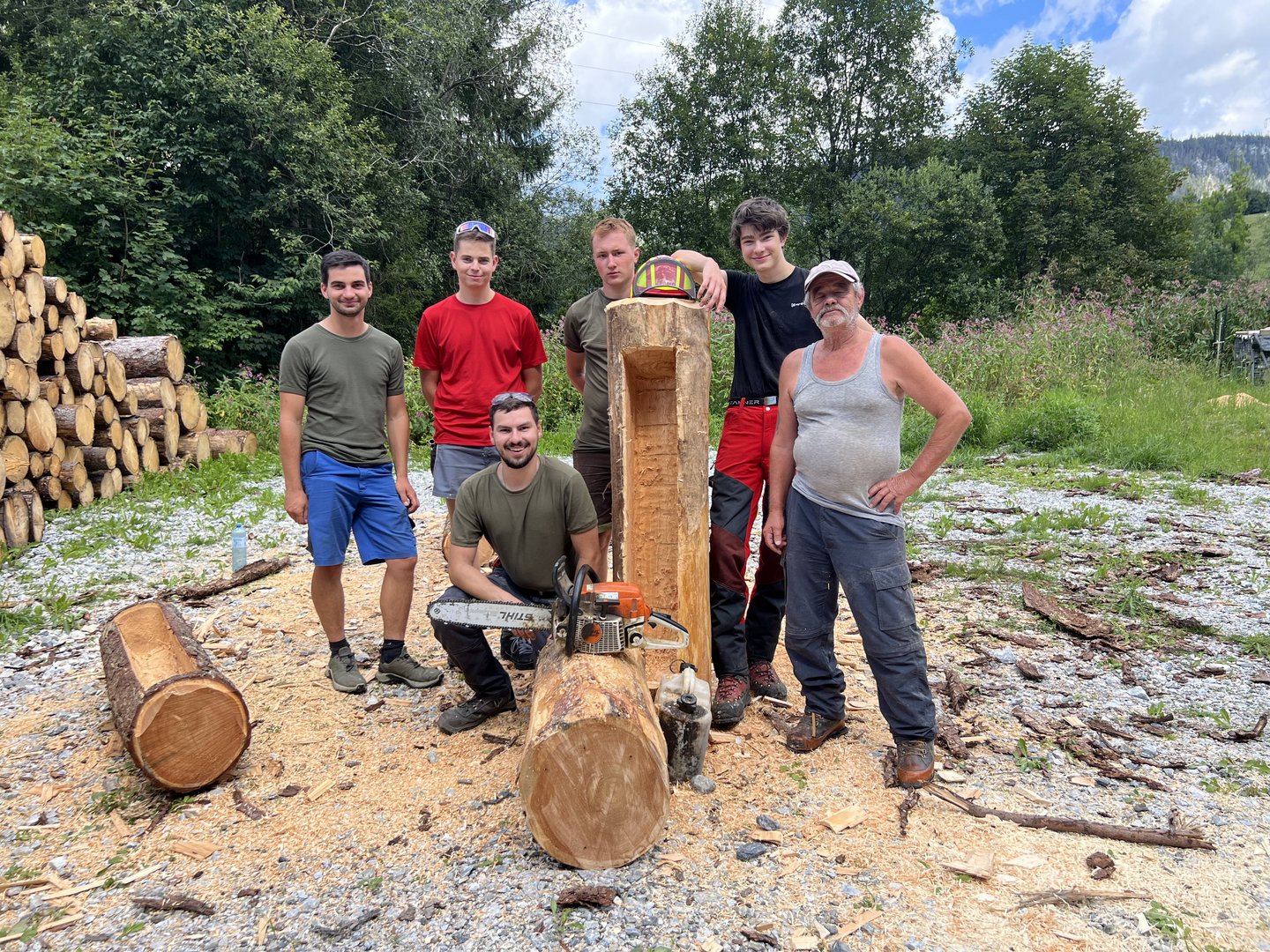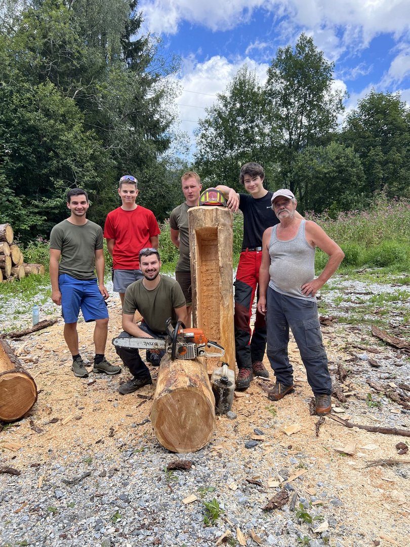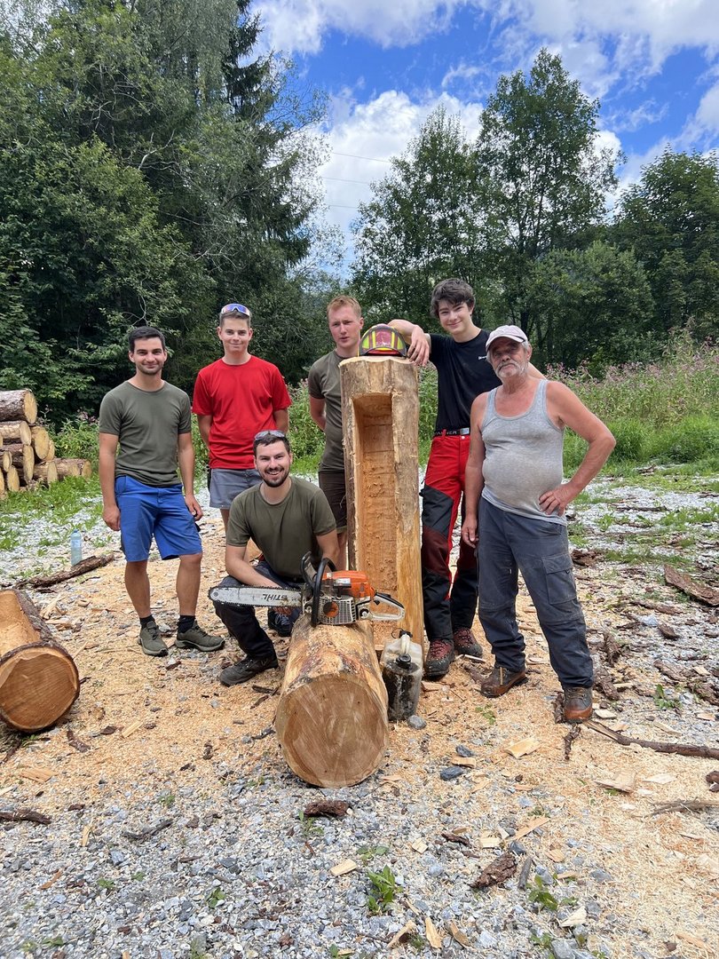Am 10.08.2024 trafen sich fünf Mitglieder des Landjugendbezirkes Liezen bei der Freiwilligen Feuerwehr Pyhrn um das schnitzen eines Brunntrogs zu erlernen.