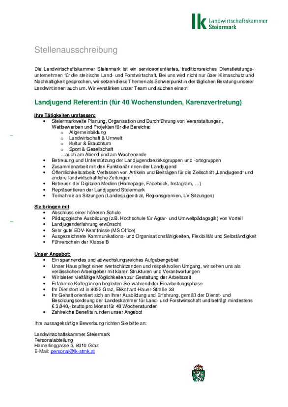 Am 23. und 24. September wurde Brauchtum und Tradition im Herzen von Liezen gelebt. Das traditionelle Bezirkserntedankfest der Landjugend, das jährlich von einer anderen Ortsgruppe im Bezirk ausgetragen wird, durfte diesmal von der Landjugend Pyhrn-Liezen-Weißenbach durchgeführt werden. Gestartet wurde am Samstag mit dem Ernteball im Kulturhaussaal, eröffnet durch eine Polonaise der Nachbarlandjugend Lassing, musikalisch umrahmt durch die „Oberwenger Power“ und mit Mitternachtseinlage der Ortsgruppe PLW sowie den „D#Hochtausinger z’Weißenbach“. Weiter ging es am Sonntag mit der Segnung der Erntekrone beim Kriegerdenkmal und anschließendem Festakt im Kulturhaussaal, wobei Ehrungen durch die Landwirtschaftskammer und die Landjugend Steiermark erfolgten. Abgerundet wurde das Erntedankwochenende durch den Ernteumzug durch die Liezener Innenstadt, wobei Landjugenden aus dem ganzen Bezirk sowie zahlreiche Vereine, Familien und Ehrengäste insgesamt über 30 liebevoll geschmückte Wägen präsentierten.