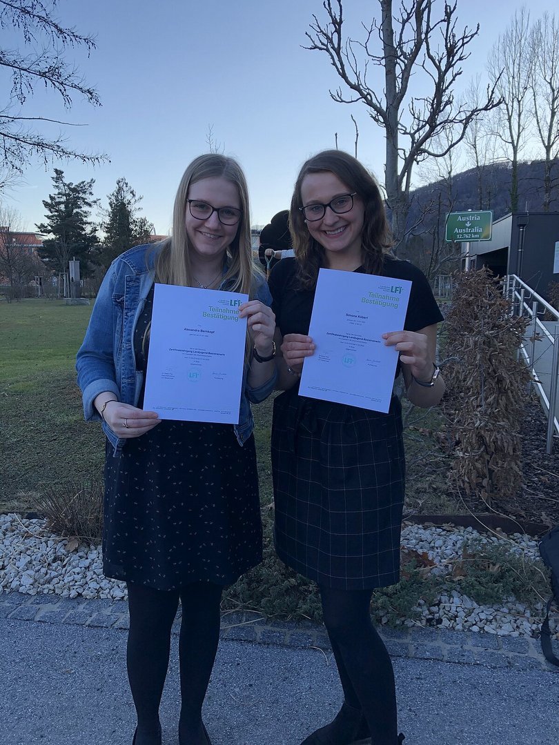 Alexandra Bernkopf (OG Lassing) und Simone Köberl (OG Paltental) dürfen sich seit 1.Februar zertifizierte Basistrainerinnen der Landjugend nennen. Seit September besuchten sie den LFI-Zertifikatslehrgang in Graz. Nach verschiedenen Modulen konnten sie die Jury mit ihrer Abschlussarbeit sowie der Abschlusspräsentation überzeugen und schlossen die Ausbildung mit ausgezeichnetem Erfolg ab. Teambuilding, Mitgliedermotivation, Rhetorik sowie sicheres Auftreten zählten zu den Hauptthemen ihrer Ausbildung.